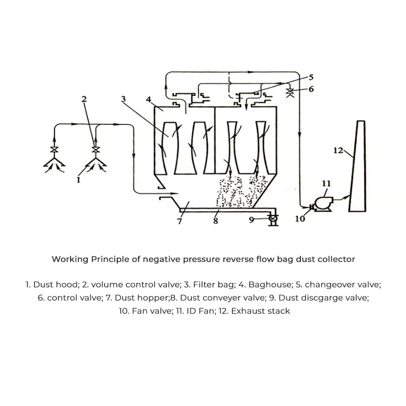 Dammuppsamlaren för negativt tryck tillbakablåsande pås är en dammborttagningsanordning som ofta används i industriell produktion. Den fungerar genom att använda undertryck för att blåsa tillbaka luft för att avlägsna damm som samlats på filterpåsarna. Huvudkomponenterna i denna enhet inkluderar en dammuppsamlingslåda, filterpåsar, en undertrycksfläkt och en bakblåsningsanordning. Jämfört med traditionella dammuppsamlare erbjuder dammsamlare för negativt tryck tillbakablåsande påsar högre dammavlägsnande effektivitet och lägre driftskostnader, vilket gör dem allt populärare bland företag.